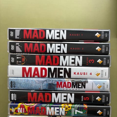 Mad Men kaudet 1–4 dvd-boksi. Paketti sisältää tv-sarjan Mad Men ensimmäisen, toisen, kolmannen ja neljännen tuotantokauden erillisissä koteloissa. Levyillä on sarjan jaksot ja mahdollisia lisämateriaaleja, kuten kommenttiraitoja ja dokumentteja (sisältö vaihtelee kausittain). Alue- ja ikärajamerkinnät näkyvät kuvissa, ääni ja tekstitys ovat julkaisijan mukaiset. Sopii dvd-soittimelle, joka tukee koteloissa ilmoitettua aluekoodia ja formaattia.