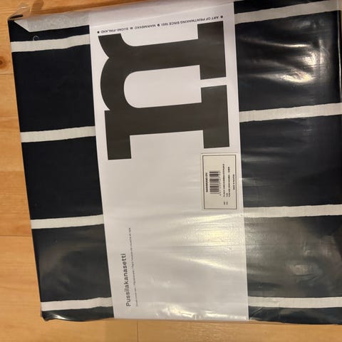Avaamaton paketti. Paketti sisältää kaksi mustaa marimekon tiiliskivi pussilakanasettiä. Pussilakanat 150x210cm ja tyynyliinat 50x60cm. Kaupanpäällisenä mukaan Marimekon kangaskassi.