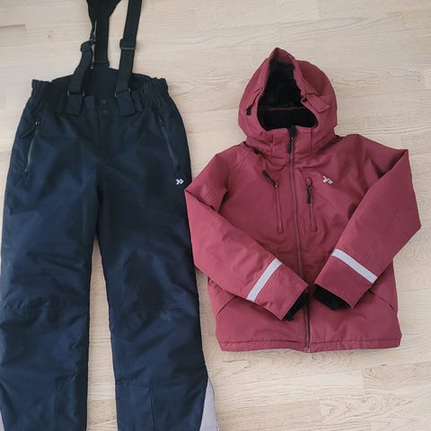 Kuvanmukaiset toppatakki ja housut. Pidettyjä mutta kelvollinen setti uudelle käyttäjälle vielä. Ei reikiä. Molemmat kokoa 150cm. Mydän settinä 10e