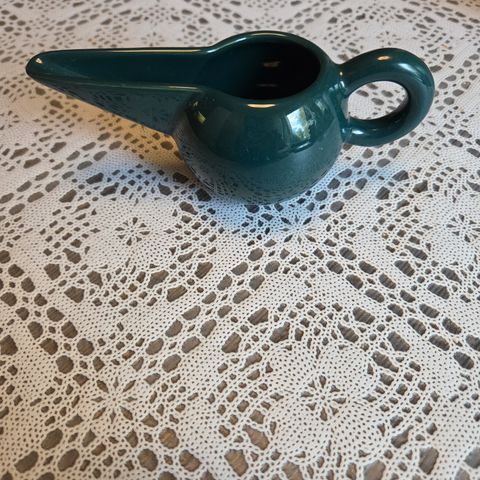 Hyväkuntoinen pieni Egersund Norway kannu/kermakko. Vetoisuus 2dl, korkeus n. 7.5cm. Kermakon sisällä pohjassa sinisiä lasite/väripilkkuja. Kauttaaltaan kevyitä kulumajälkiä jotka näkyvät lähinnä valoa vasten, katso lisäkuvat. Savuton ja eläimetön talous.