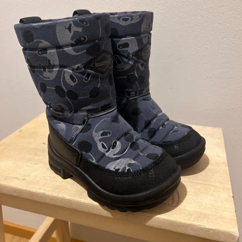 Kuoma lasten talvikengät, koko 26, unisex-malli. Kengissä on sininen päällinen kuviolla ja mustat vahvikkeet kärjessä ja kantapäässä. Paksu kumipohja tarjoaa hyvän pidon liukkaalla. Sisäpuolella on lämmin harmaa vuori, joka sopii kylmiin olosuhteisiin. Soveltuvat sekä tytöille että pojille talvikäyttöön ja ulkoiluun.
