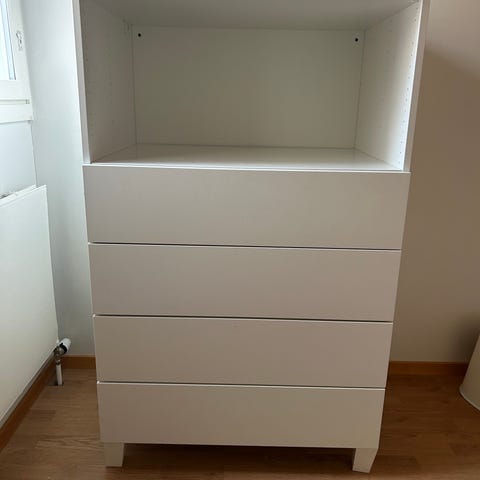 Valkoinen puinen lipastokaappi, jossa useita erikokoisia laatikoita säilytykseen. Yläosassa on pienempiä laatikoita ja alaosassa useita suurempia laatikoita. Laatikoissa on metalliset puolipyöreät vetimet. Sopii esimerkiksi makuuhuoneen, olohuoneen tai eteisen säilytyskalusteeksi.