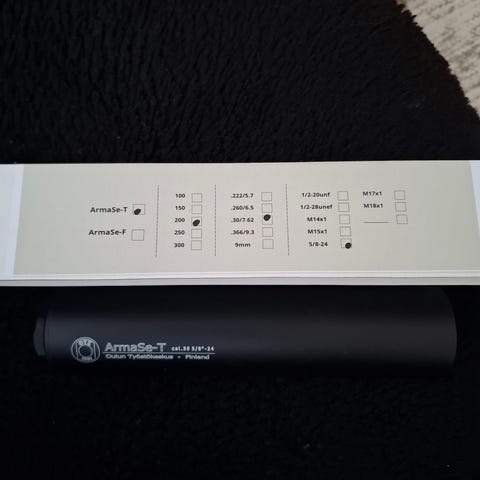 A-Tec Hertz 119 vaimennin. Ollut 9,3x62 Tikan vaimentimena. Ammuttu n. 60-70 laukausta. Vaimentaa rekyylin tosi hyvin. Myin aseen ja nyt toimettomana kaapissa. Kierre 15x1.