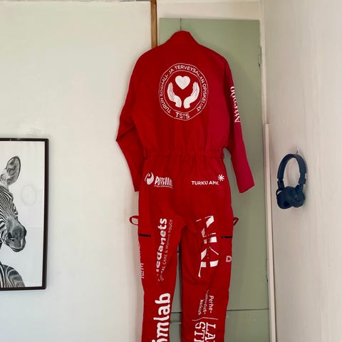 Hyväkuntoinen vähäkäytetty haalari. Muuten hyvässä kunnossa mutta lahkeissa vähän auringon haalistamaa. Ollut 170cm pitkällä naisella. Vyötärö noin 90cm