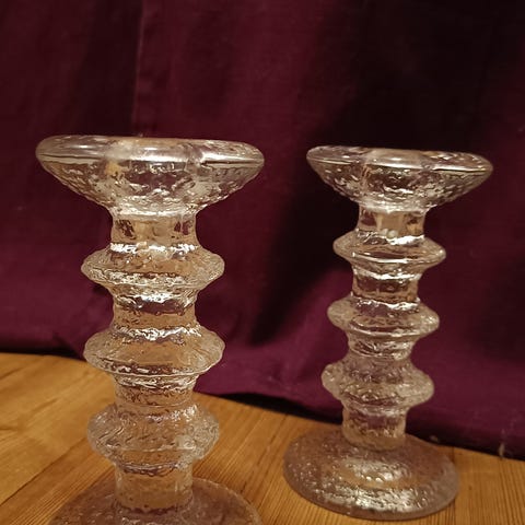 Kaunis Iittalan lasinen kynttilänjalka. Ei käytön jälkiä, ainoastaan tarra on vuosien saatossa häipynyt lähes olemattomiin. Suunnittelija Timo Sarpaneva. Ei signeerausta.