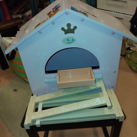 Tallissa hieman kulumaa katonpidike osissa ja muutamassa aitauksen sivussa pidike osa poikki, mutta ei estä tallin kokoamista ja sen käyttöä.