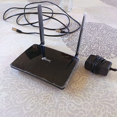 TP-LINK Archer MR200 -LTE-modeemi ja WiFi-tukiasema. Tällä sim kortilla wifi verkko kotiin. Lisäantenni triax.
