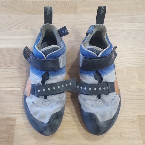 Myydään Tenaya Ra -kiipeilykengät, jotka sopivat sekä sisäkiipeilyyn että ulkokiipeilyyn. Kengissä on kaksinkertainen tarrakiinnitys oransseilla remmeillä, jotka takaavat tukevan ja nopeasti säädettävän istuvuuden. Musta–harmaa päällinen on kestävä ja ajattoman tyylikäs.