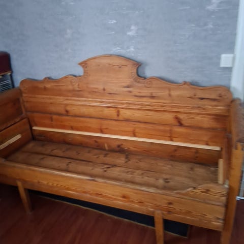Sohvassa on kevyesti pehmustettu kansi, jonka kangas on rikki mutta helposti vaikka itse vaihdettavissa. Kannesta on jäänyt sohvaan pienet kulumat, jotka näkyvät kuvissa. Jalat ovat hiukan pidemmät sillä puolella, josta sohva levitetään, joten sivusta katsottuna sohva on vinossa. Sitä ei juurikaan huomaa, ellei sohvaa katso sivusta. Maalipinnassa on pientä kulumaa/patinaa kun katsoo tarkasti.