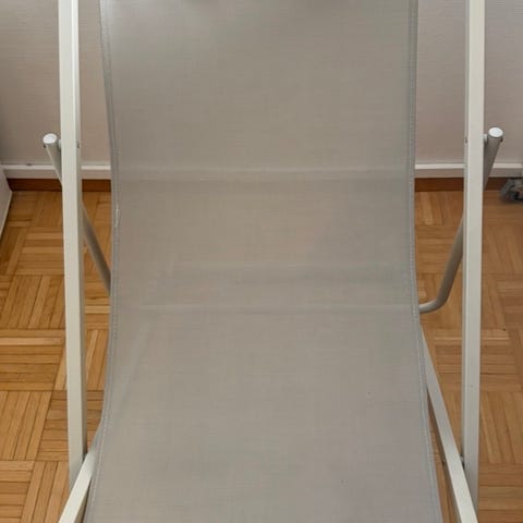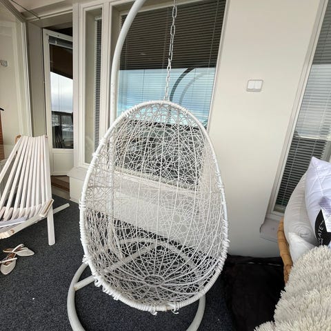 Riipputuoli pehmusteella. Valkoinen metallirunko ja punottu kori, jossa vaalea, paksu istuinpehmuste ja niskatyyny. Soveltuu parvekkeelle, terassille tai sisäkäyttöön rentoon istumiseen ja oleskeluun.