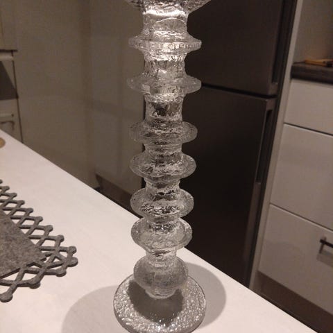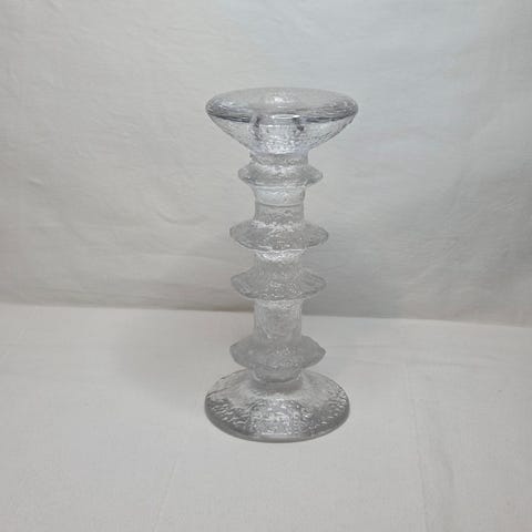 Iittalan lasinen kaunis kynttilänjalka. Ei käytönjälkiä, ainoastaan tarra haalistunut vuosien saatossa. Suunnittelija Timo Sarpaneva, pohjassa signeeraus TS.