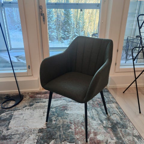 3 KPL AVAILABLE!!! Verhoiltu ruokatuoli käsinojilla. Sininen kuviollinen kangas ja mustat puujalat. Mukava istua ja tukeva rakenne. Sopii ruokapöydän tuoliksi tai oleskelutilaan. Hyvä kunto. 55€/1 kpl 125€/3kpl