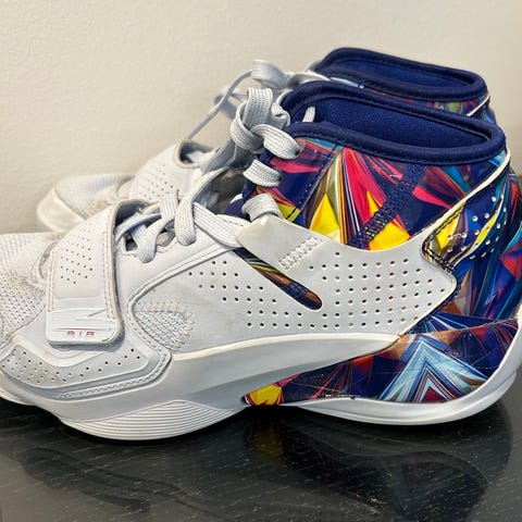 Jordan Step lasten korislenkkarit koko 38,5. Väri valkoinen sinisin ja punaisin yksityiskohdin. Päällinen verkkokangasta ja synteettistä materiaalia, nauhakiinnitys. Pohjassa kuvioitu kumipohja, joka tarjoaa pitoa. Soveltuvat arkeen ja liikuntaan lapsille.