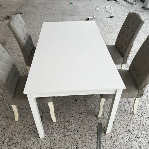 Valkoinen ikeasta alunperin ostettu pieni keittiönpöytä ja askosta ostetut consep oak ruokatuolit.