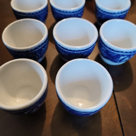 Sininen punainen ja vihreä munakupit hyväkuntoisia, keltaisessa munakupissa rike. Näkyy kuvissa