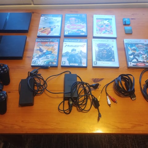 Mukaan alkuperäinen DualShock 2 ohjain ja Logitechin langaton tarvike ohjain. DualShockin johto vähän kärsinyt ”korjattu” teipillä. Toimi kuitenkin moitteettomasti kun testasin. Logitech toimi ongelmitta.