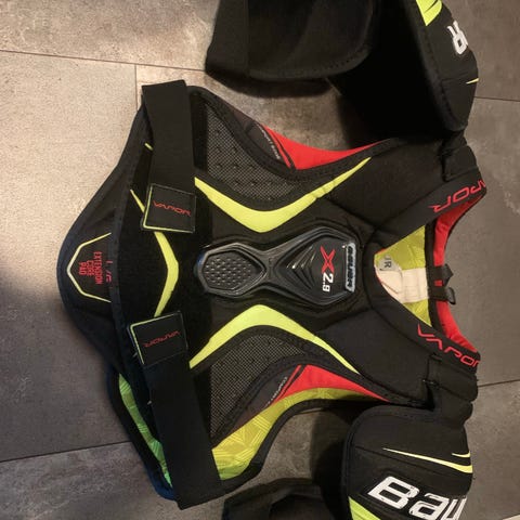 Lasten hyväkuntoinen rintapanssari Bauer Vapor X40, koko Junior M. Suojat ehjät, mutta kangas jostain hieman rikki, esim. Kuva 3. Ei kuitenkaan haittaa käyttöä. Nouto tai postitus.