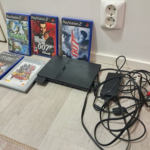 PlayStation 2 Slim ja 2 ohjainta.