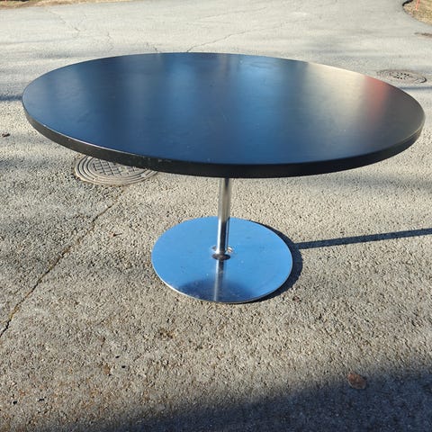 Pyöreä ruokapöytä, jossa musta pöytätaso. Pöytä soveltuu usealle istujalle ja sopii esimerkiksi keittiöön tai ruokailutilaan. Materiaalina todennäköisesti puu tai puupohjainen levy. Pöytä seisoo keskijalan varassa, mikä helpottaa tuolien sijoittelua pöydän ympärille.
