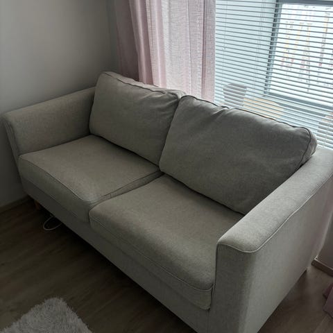 Myydään vaaleanharmaa Ikean PÄRUP 2:n istuttava sohva. Muutoin hyvässä kunnossa, mutta sohvan takana kangas hieman revennyt sohvan jalan vierestä. Ei näy käytössä jos sohva seinää vasten .