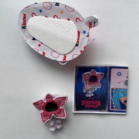 Kinder Stranger Things -yllätysleluhahmo. Pakkaukseen kuuluu pieni Stranger Things -teemainen hahmo sekä kuvallinen esite. Muovinen keräilyhahmo sopii esimerkiksi leikkeihin tai kokoelmaan.