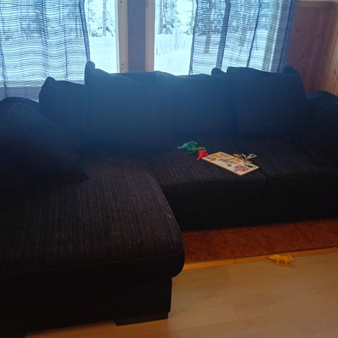 Vaalea kulmasohva jossa yksi rikama vasemman reunan tyynyssä. Ei vaikuta käyttöön. Päälliset pestävät. Kätisyyttä ei voi vaihtaa. Mitat 2100x2500mm. Hinta 50€