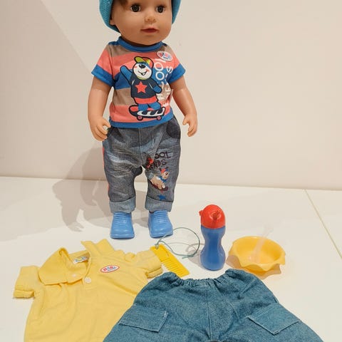 Nukke hyväkuntoinen muuten, mutta oikea silmä ei mene kiinni "itsestään". Saa laitettua itse kiinni, en tiedä voiko korjata. Tarvikkeet siistit leikeissä olleita.