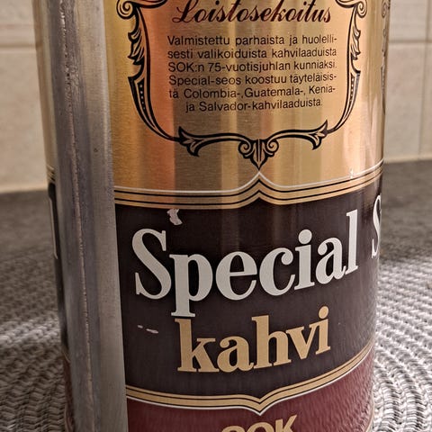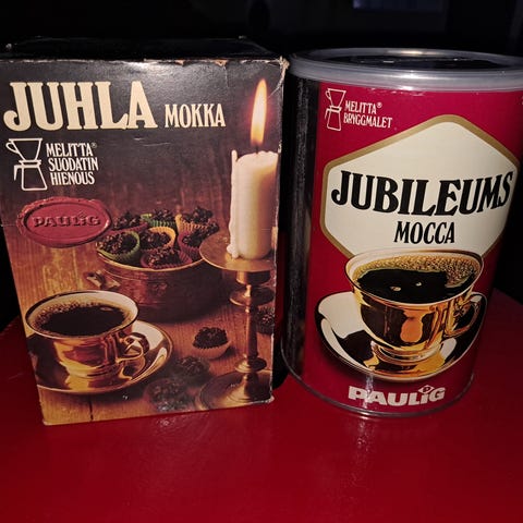 Myydään hyvässä kunnossa oleva Pauligin 120-vuotisjuhlavuoden (1996) kunniaksi julkaistu Gustav Paulig original erikoiskahvin juhlapakkaus. Keräilijän löytö, kunto siisti. Pohjassa pieni särö, kts kuva 3. Muuten ei merkittäviä naarmuja tai lommoja. Täysin alkuperäinen avaamaton 500 g kahvipakkaus. Mukana alkuperäinen Pauligin mittalusikka. Valmistettu 29.10.1996, päiväys näkyy pakkauksessa. Kahvi vanhaa, ei nautittavaksi😊