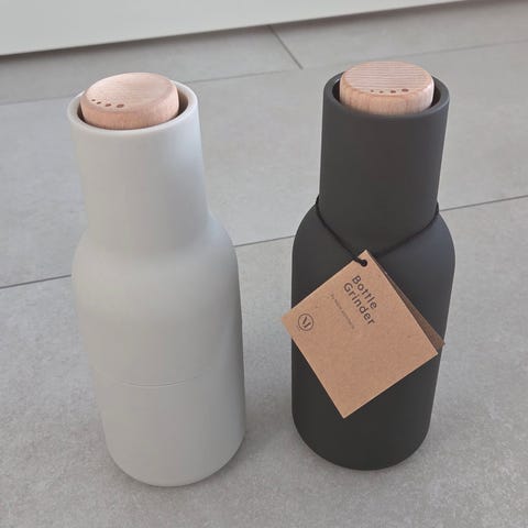Muuton valmistama "Plus" suola-/pippurimylly, joka on koottu erikokoisista puisista osista.
