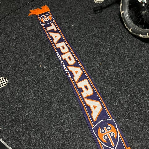 Tappara kannatushuivi. Toisella puolella tummansininen ja toisella vaalea pohja, molemmilla puolilla oranssilla ja sinisellä Tappara-teksti ja logo. Sopii käytettäväksi otteluissa ja muissa kannatustilanteissa kaulahuivina tai sisustuselementtinä esimerkiksi seinälle ripustettuna.