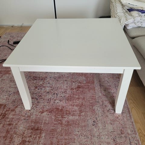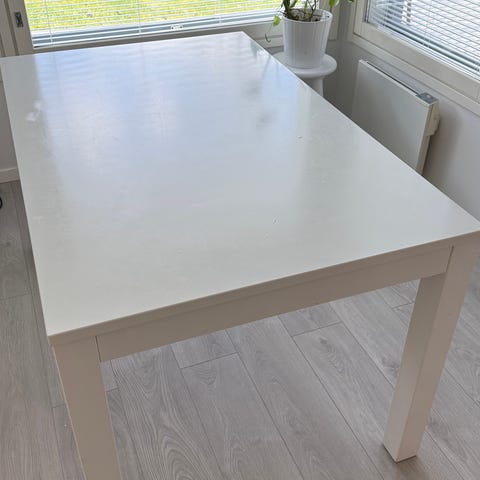 Ruokapöytä, suorakulmainen malli. Pöydässä on valkoinen kansi ja neljä suoraa jalkaa. Sopii käytettäväksi ruokapöytänä tai työskentelypöytänä usealle hengelle. Muotoilu on pelkistetty ja selkeä, mikä helpottaa yhdistämistä erilaisiin tuoleihin ja sisustustyyleihin.