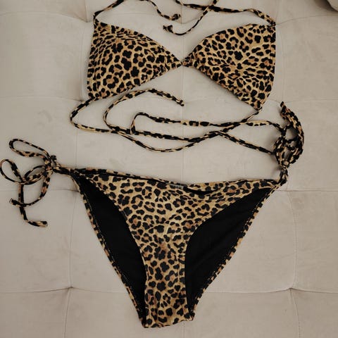 Kuvan mukainen leopard kuosinen bikini/rintaliivi+käsivarteen(?) laitettavat erilliset osat. Koko 38/40/M ympäryys mitta n 64cm.