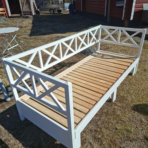 Mindre träsoffa i gott skick. Soffan är lätt, stabil, brunmålad och klädd i ett brunt tyg. Det är lätt att byta tyg då sitsen och ryggpanelen är löstagbara. Soffan är i stort sätt snygg, men det finns några märken i den målade ytan men inte skador i träet. I tyget finns en fläck.