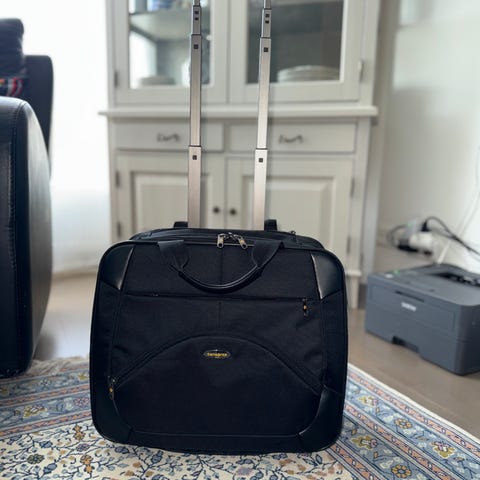 Tyylikäs ja käytännöllinen musta Samsonite-pyörälaukku. Laukku on käytetty, mutta hyvässä kunnossa ja sitä on pidetty hyvin huolta. Pyörät ja teleskooppikahva toimivat sujuvasti, ja kaikki vetoketjut ovat ehjiä ja toimivia.