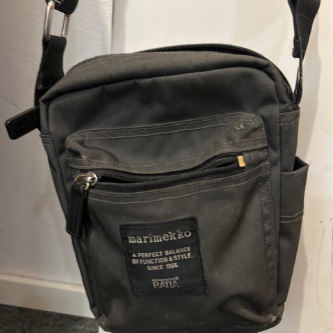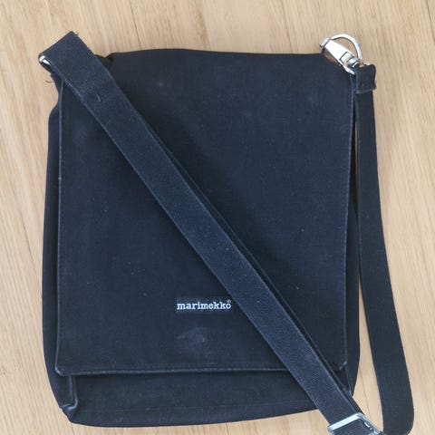 Marimekko olkalaukku unisex-käyttöön. Laukku on valmistettu kankaasta ja siinä on säädettävä olkahihna. Etuläpässä on tarrakiinnitys ja Marimekko-logo. Laukussa on vetoketjullinen päälokero ja sisäpuolella tilaa esimerkiksi puhelimelle, lompakolle ja pienille tavaroille. Väri on tumma, yksityiskohtina mustaa ja punaista.