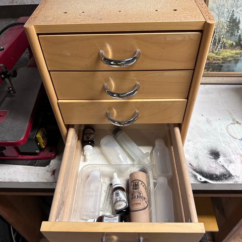 Laatikoiden pohjat ei pysy kunnolla paikoillaan, ja liukukiskojen laakeroinneista on tippunut kuulia pois (ei tallessa).