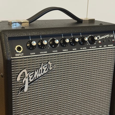 Fender Champion 20 kitaravahvistin. Kompaktikokoinen combo-vahvistin sähkökitaralle. Teho 20 W ja yksi kaiutin takalevyn mukaan. Etupaneelissa säätimet muun muassa äänenvoimakkuudelle, gainille, ekvalisaatiolle ja efekteille. Vahvistimessa on yksi instrumenttituloliitäntä sekä virtaliitäntä takapaneelissa. Väriltään musta, hopeasävyisellä eturitilällä ja kantokahvalla yläosassa.