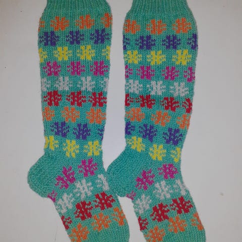Villasukat 7 -veljestä langasta. Varren mitta 35 cm ja jalkaterä 24.5cm. Postikulut s-kokoisessa paketissa (mahtuu muutakin) 4 euroa tai Toridiilin kautta.