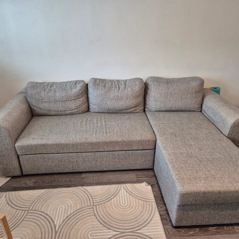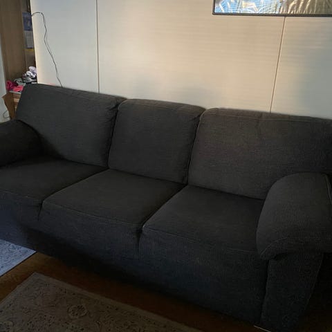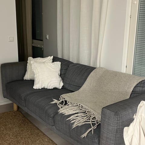 Annetaan kolmen istuttava sohva. Siisti kuntoinen ja hyvä istua. Istuin syvyys 56cm. Omat kantajat mukaan.