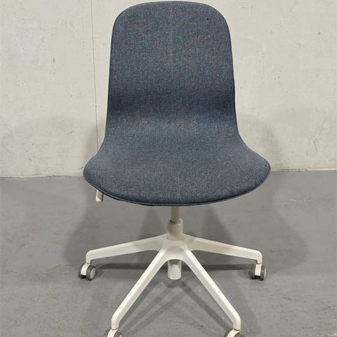 Ikea Långfjäll toimistotuoli, jossa on pyörät ja valkoinen jalusta. Tuolissa on moderni muotoilu ja se on säädettävissä korkeussuunnassa.