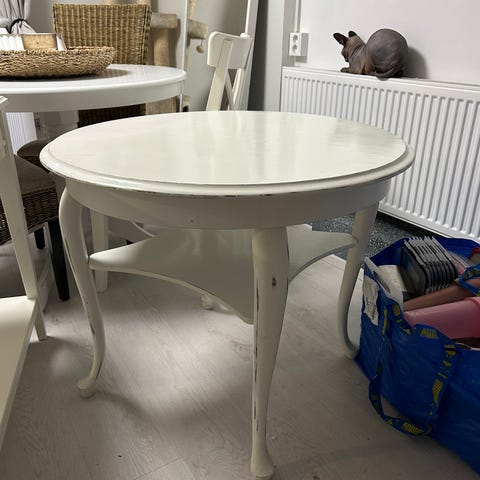 Pyöreä pöytä, jossa on krominen pinta ja nelijalkainen jalusta. Pöydän pinnassa on havaittavissa käytön jälkiä ja naarmuja.