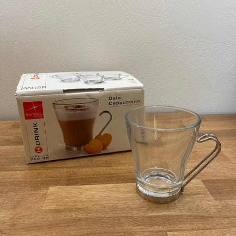 Oslo Cappuccino 2x4kpl lasimukeja, yhteensä 8kpl, vetoisuus 22cl, ehjiä ja kerran käytettyjä, hinta yhteensä.