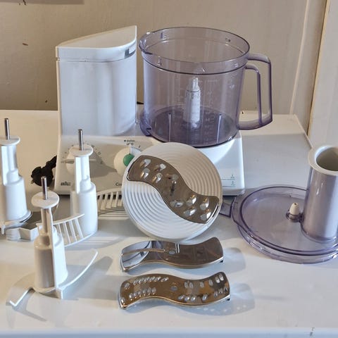Braun Combimax 600 monitoimikone. Laitteessa on läpinäkyvä kulho mitta-asteikolla sekä useita erilaisia teriä ja levyjä esimerkiksi viipalointiin, raastamiseen ja sekoittamiseen. Sopii ruoan pilkkomiseen, sekoittamiseen ja erilaisten massojen valmistukseen keittiössä.