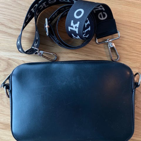 Marimekko nahkainen olkalaukku naisille. Laukku on mustaa nahkaa ja siinä on vetoketjusuljenta. Mukana tulee irrotettava ja säädettävä olkahihna, jossa on Marimekko-logo. Teksti on molemmin puolin. Laukku sopii arkeen ja vapaa-aikaan pienten henkilökohtaisten tavaroiden kuljettanuseen.