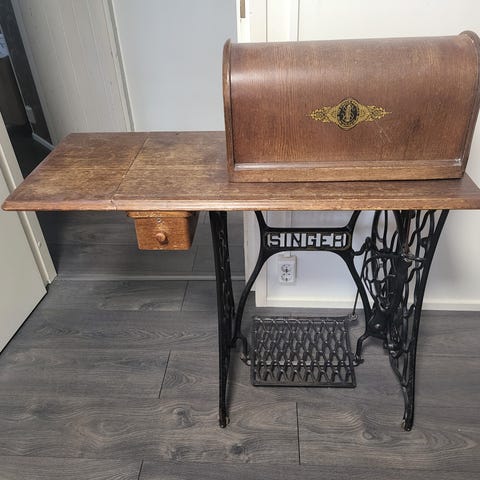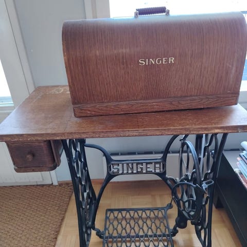Kuvan ompelukone painava, vanha. Vaikka koristeeksi.