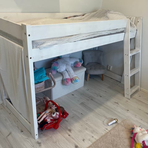 IKEA parvisänky lapsille. Metallirunkoinen, harmaa sänky, jossa ylös johtavat sivutikkaat (tikkaat voi laittaa vasen/ oikea pääty) ja suojakaiteet koko yläreunan ympäri. Korkea malli, jonka alle jää runsaasti tilaa esimerkiksi työpisteelle, säilytykseen tai leikkitilaksi.