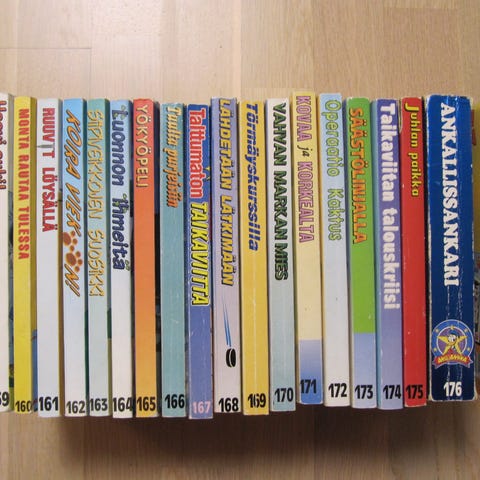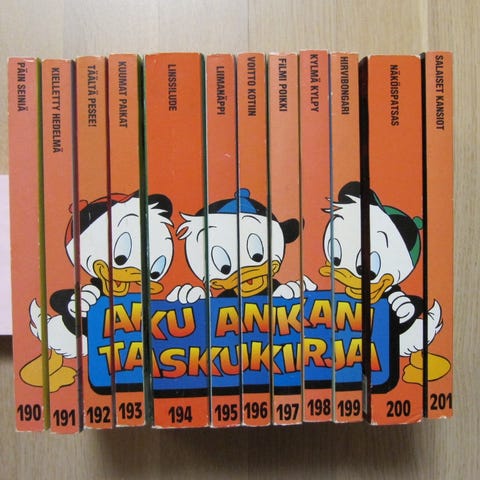 Aku Ankan taskukirjat 178-189, yht. 12 taskaria, 15 €. Nouto Kuopiosta keskustasta. Pakettiautomaattilähetys Manner-Suomeen 6 euroa, josta saa lähetyksen seurantanumeron. En käytä ToriDiiliä.