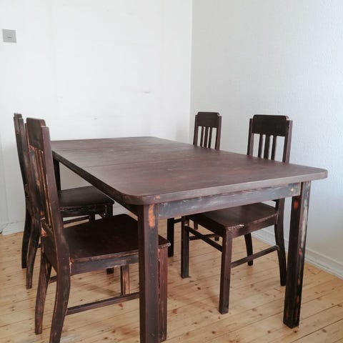 Hankittu 1988, ollut perheen käytössä 30 vuotta, hiottu ja öljytty ennen nykyistä varastointia. Jalat irroitettu ( pulttikiinnitys).