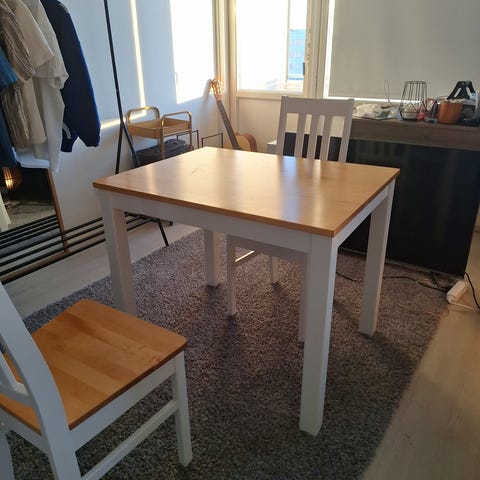 Koivuviilupöytä, leveys 85 cm, koko pituus 180 cm, lyhennettävissä poistamalla välikappale (44,5cm). 4 tuolia (kaikissa on tukeva rakenne, mutta selkänojan maalipinnassa kulumaa).
