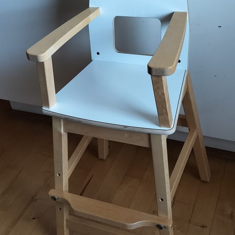 IKEA syöttötuoli. Musta runko ja valkoinen istuinosa sekä irrotettava valkoinen tarjotin. Soveltuu lapsen ruokailuun pöydän ääressä. Materiaalina puu- ja muoviosat, helppo pyyhkiä puhtaaksi. Selkänojallinen malli, jossa jalkatuki lisää istumamukavuutta.
